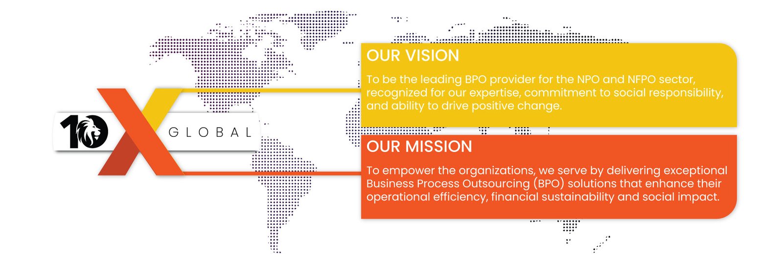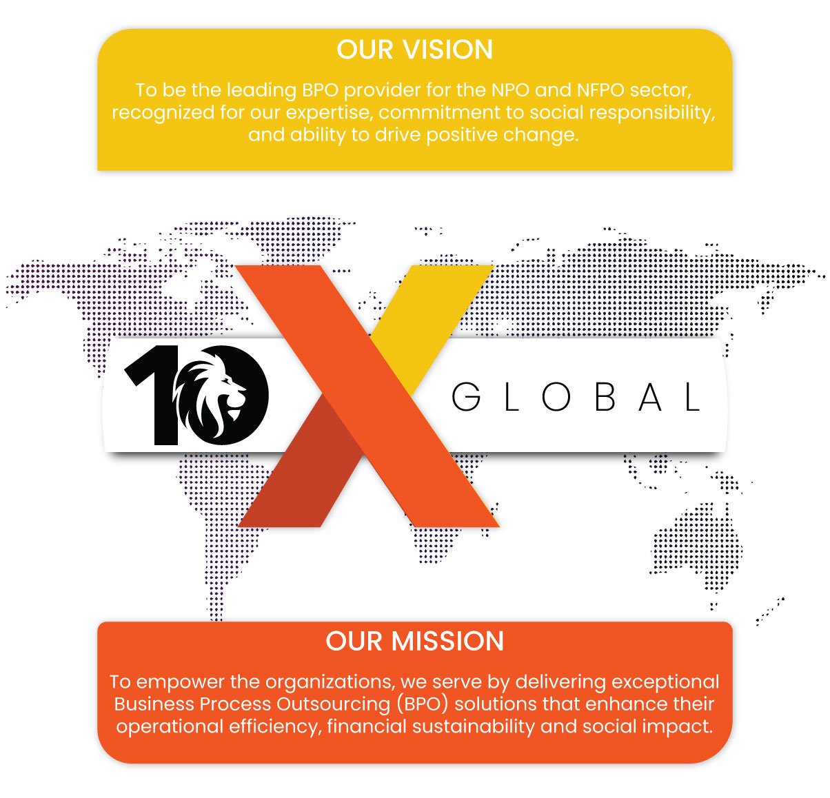 At 10X Global, we aim to be the most sought after BPO / KPO solutions provider in the sectors we operate and are passionate about making a positive social and economic impact across the world by supporting the important work of NPOs and NFPOs globally. With a deep understanding of the unique challenges and opportunities faced by these organizations, we are committed to delivering high-quality services that align with their mission, values and regulatory frameworks.